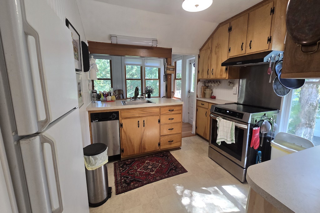 Kitchen appliances include glass-top electric stove, refrigerator, and dishwasher.