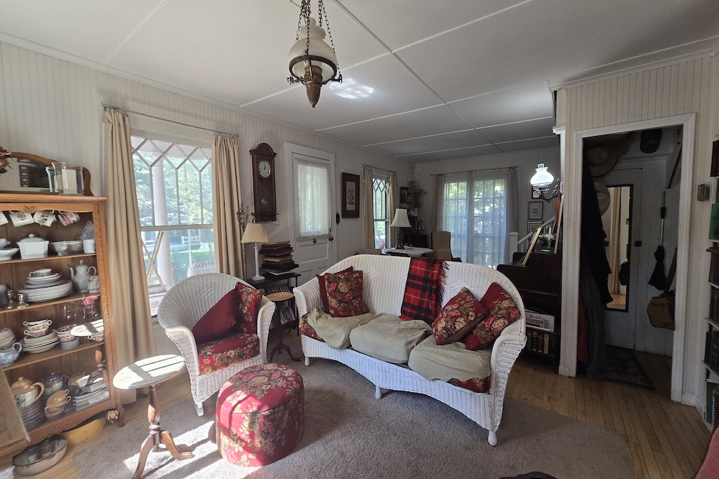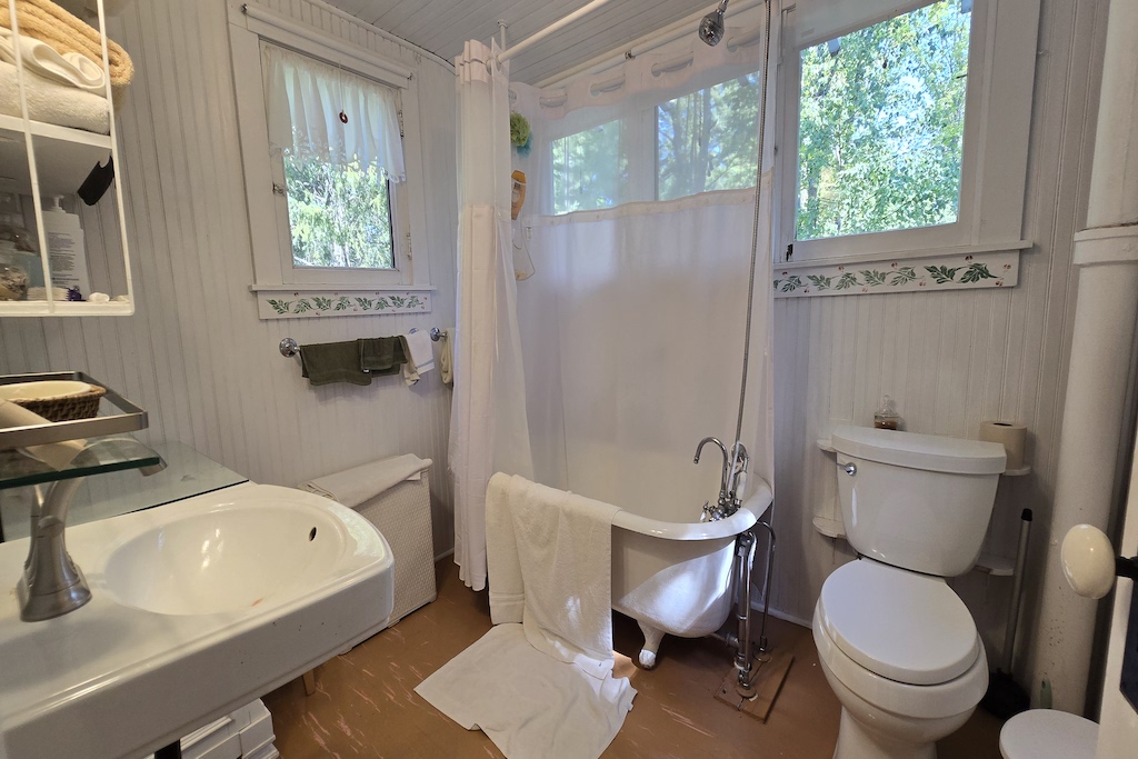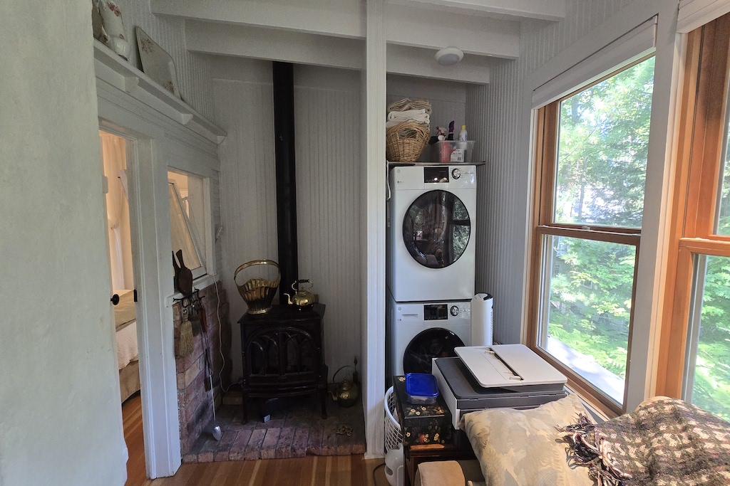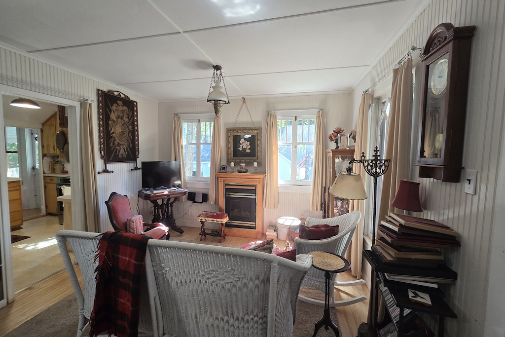 Main Floor: 1 bedroom, full bathroom, laundry (stackable), kitchen with modern appliances, open sunroom/dining area, cozy fireplace.